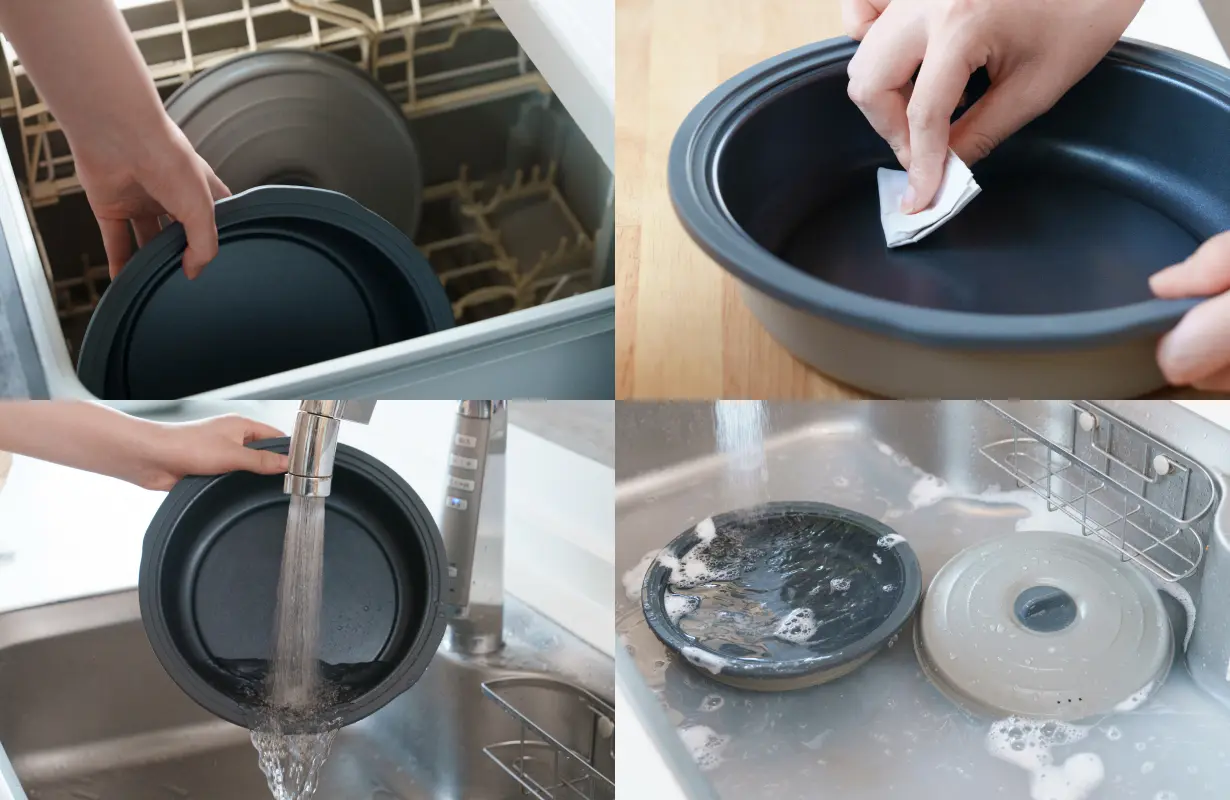 お手入れのしやすさ:フラットな調理面、食洗機対応、丸洗い可能