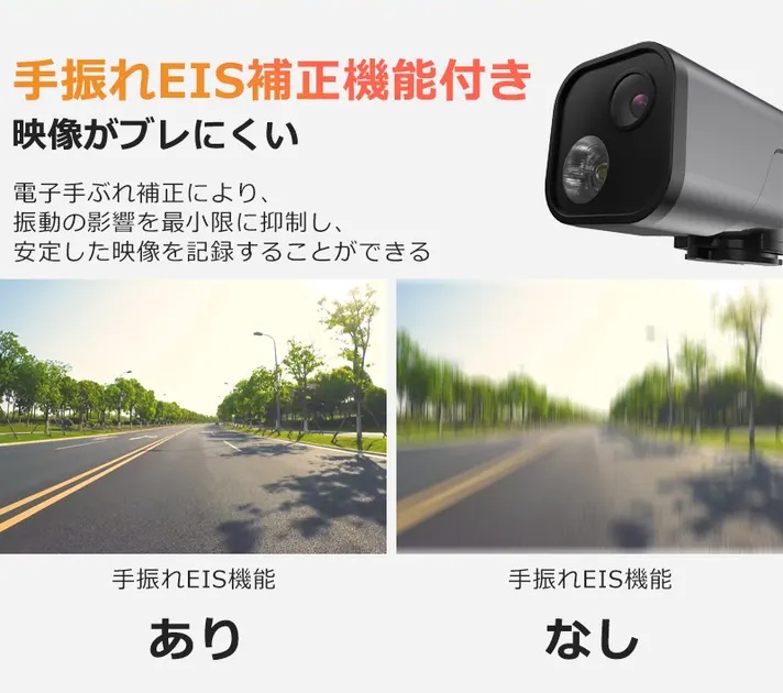 6軸ジャイロセンサーで手ブレや振動を検知・補正。舗装の悪い道でも映像がぶれにくそう。