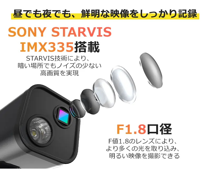 高感度センサー(SONY製STARVIS IMX335)搭載で、暗い場所やトンネルでも“光を集めて綺麗に撮る”設計。